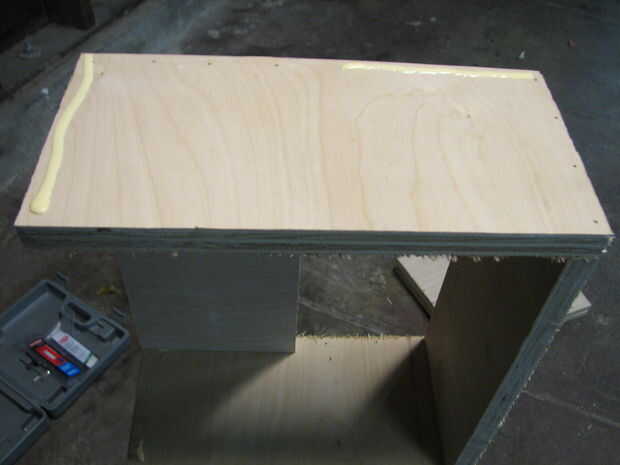Una vez que la junta esté en su lugar, pegar dos nuevas tablas verticales en horizontal. En el paso anterior, se colocaron las dos tablas verticales a lo largo del borde izquierdo y el borde derecho de la espalda. Esta vez, coloque las tablas a lo largo del borde derecho y el borde de la parte posterior izquierda. Esto le dará espacio para colocar la pistola de clavos bajo el pegamento nuevamente juntas, y para arrancar clavos a través de la junta horizontal en las juntas verticales, fijando las tablas en su lugar.