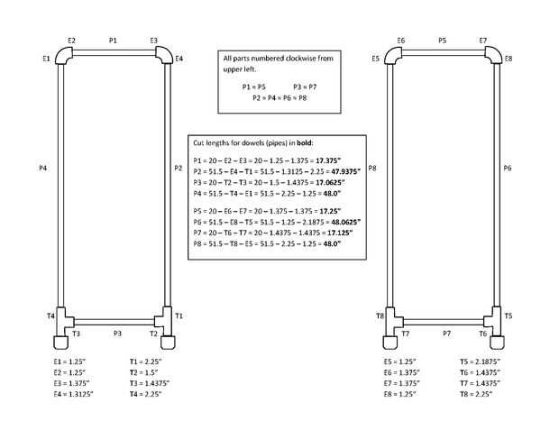 El proceso para hacerlo es simple, sin embargo es complicado por la realidad que cada uno de los acoplamientos de PVC ahora probablemente se ajusta algo diferentemente que uno al otro. Para determinar el ancho y alto se agregará cada cople PVC, simplemente prueba ajuste cada acoplamiento encajando perfectamente en el extremo de una varilla de pasador marcado en 5 pulgadas (esta longitud es arbitraria). Tope final con el PVC acoplamiento contra una superficie plana (yo usé un bloque de madera) y la medida de que la superficie a la marca en la espiga. La anchura y altura que cada cople PVC agrega es lo que la longitud es menos de 5 pulgadas. Hacer esto para cada acoplamiento de PVC numerado en el esquema (E1 a E8 y T1 a T8), he incluido mis medidas en la parte inferior. Es una buena idea para hacerlo más de una vez en cada acoplamiento y luego medir y marcar cada sección de barra de pasador con el número correspondiente en el acoplamiento (véase el diagrama y las fotos en el paso siguiente).