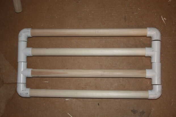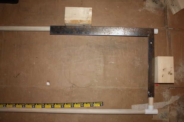 Todos los extremos cortados de los tacos de arena y prueba todo ajuste por armar el diagrama en el paso anterior. Todas las secciones de la tubería horizontal deben tener la misma longitud (ver foto), así como las secciones de tubería vertical. Una vez todo está montado, asegúrese de que todos los ángulos son la Plaza y que sus dimensiones son correctos y coinciden con el diagrama.