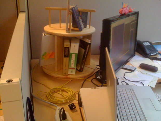 mi escritorio en el trabajo está diseñado para sostener un CRT gigante en la esquina. Pero en el siglo XXI, voluminosos tubos de vacío fueron substituidos por finísimo pantalla plana. Mientras que esto libera un montón de valiosos inmuebles desktop, es difícil llegar a la esquina profunda detrás de la pantalla. Decidí añadir un lazy susan allí para sostener mis libros de referencia. El estante inferior es 18 pulgadas de diámetro y 11 pulgadas de alto, por lo que puede llevar libros grandes y el estante superior es de 16 pulgadas de diámetro, con una "barrera" de los libros más pequeños del corral de 6 pulgadas. El proyecto también es adecuado como un banquillo muy perniciosa.