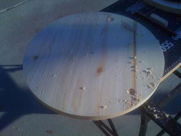 Usted debe ser capaz de encontrar estas piezas en la ferretería local o centro. Algunos de ellos incluso venden discos cortados madera en contrachapado o pino laminado. La madera es fuerte, pero los bordes no acaban eso bien. Corté mis propios discos de algunos hoja de pino laminado de 3/4 de pulgada, que era más barato que conseguir discos de cortados y el resto de la población es álamo.