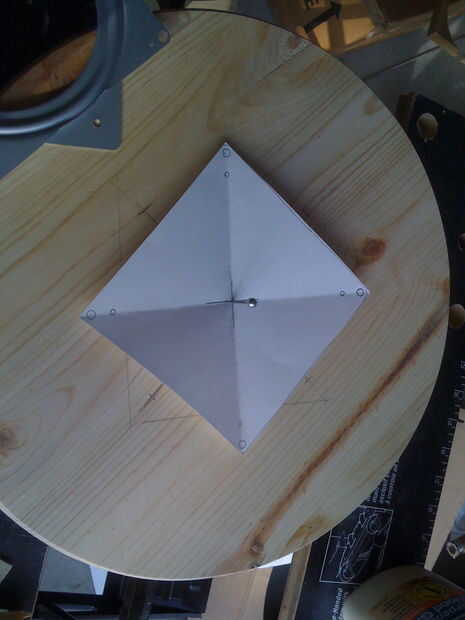 En esta etapa que queremos hacer alguna maqueta, no atornillar el hardware en su lugar hasta que todo montaje y acabado se realiza. Así que si tu hardware no viene con una plantilla útil, construir su propio. Cortar un cuadrado de las mismas dimensiones que la placa y doble en las diagonales para encontrar el centro. Recuerde, si no centro el hardware, la plataforma a vibración excesiva cuando gira. Pero no en el buen sentido. Diseño y taladre los agujeros en la base y la parte inferior del estante inferior y perfore los agujeros grandes en el grado 45 desplazamientos en la base. Asegúrese de que usted tiene algún margen de maniobra - mina fueron un poco apretado, y tuve que pegar los tornillos en el uso de pinzas hemostáticas. Cuando termines con la disposición y taladre, guarde el hardware en una bolsa sellada para que no contamine con aserrín.