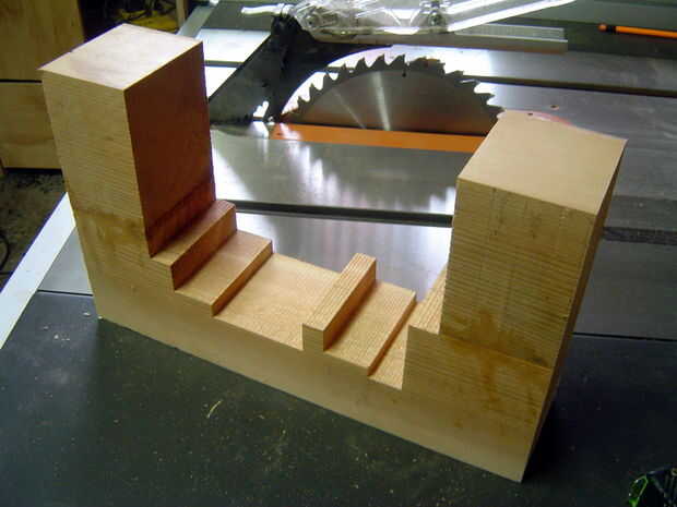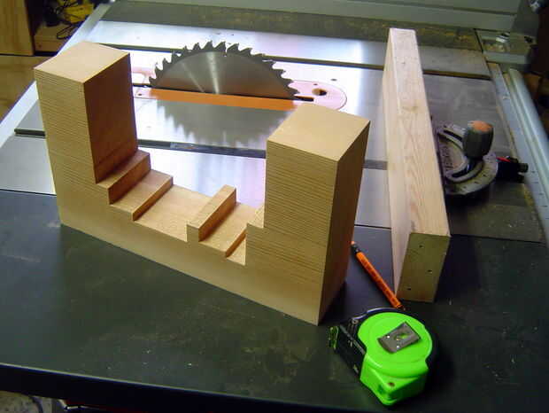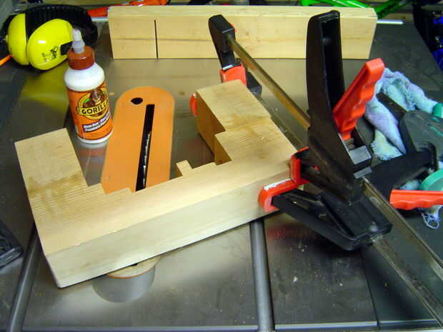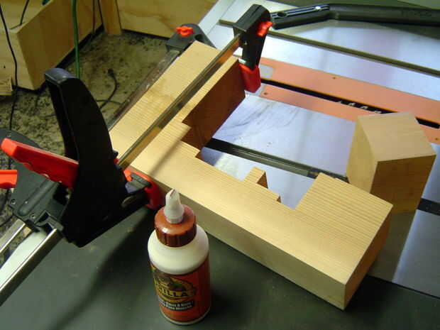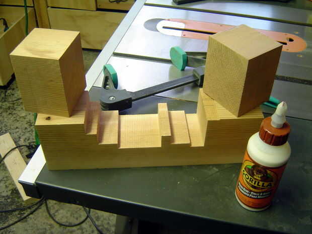 Cortar la pieza superior de los derecha anchos para establecer las partes de la librería. Pegamento y pinzas cuidando correctamente a la línea de la veta de la madera y asegurar que los bloques de madera están perfectamente alineados. Dejar secar durante la noche. Hice uno de los extremos a la vez, porque era algo torpe y además, sólo tengo 2 pinzas que tenían amplia suficientes aberturas para este trabajo. Una vez seco, recortar al ancho.