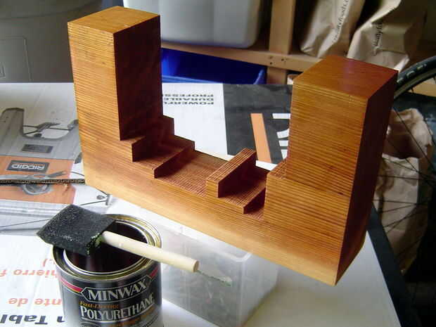 Lijar todo con lija de 100 en una lijadora orbital, aunque he dejado la parte trasera de la librería de áspero. Esto era intencional - me gustó la idea de alguien recoger la librería y ver que la madera se recicla. Limpiar el soporte con aguarrás para quitar el polvo y había terminado el stand con tres capas de poliuretano transparente brillante, lijar con grano 220 entre las capas.