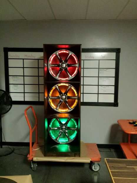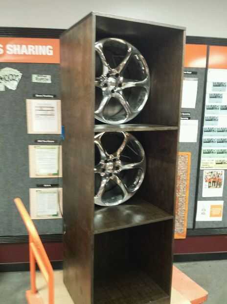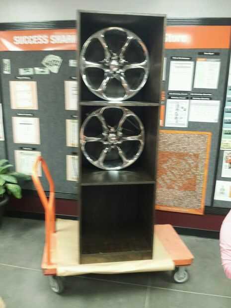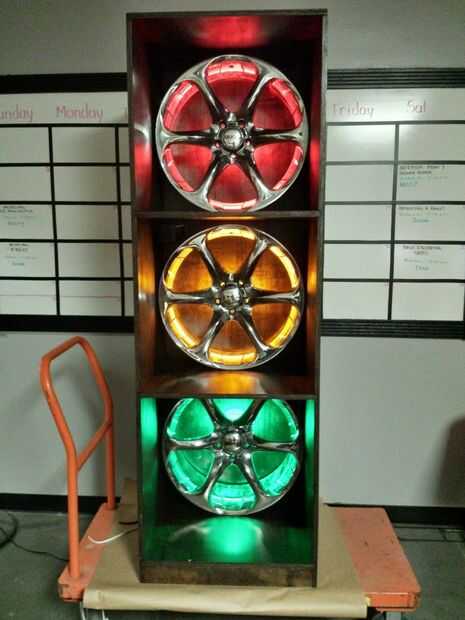 Una vez seco, era hora de cuidadosamente vuelva a montar los paneles de atrás juntos. Usando una lluvia de pinzas de madera, pegamento, tornillos y la mano de unos compañeros asociados; con cuidado lo tenemos todos puestos juntos sin un rasguño. Luego vino el cableado. Como se mencionó antes, utilicé alambre de cierre de 14-2 para la flexibilidad y para colorear. El siguiente problema a superar fue cómo ocultar los cables desde ser visto dentro de la llanta y los cubbies en los estantes. Acabé usando 1" montaje cuadrados para ataduras de cremallera y encamina el cable detrás de uno de los radios de la llanta y encamina el cable a través del agujero en el vástago de la válvula debería haber sido. Tenía el agujero del vástago de la válvula apuntando hacia arriba y luego había un agujero perforado cerca de él y pescaban el alambre por la parte trasera de la librería. Con algunas correas del conducto, había enruta todos los cables, abajo y a través de la parte trasera de la librería de un punto focal justo tras la vieja trabajo caja eléctrica. el cable en la caja de pesca, con cable 3 interruptores por consiguiente y sellar la caja con la placa de madera teñida.