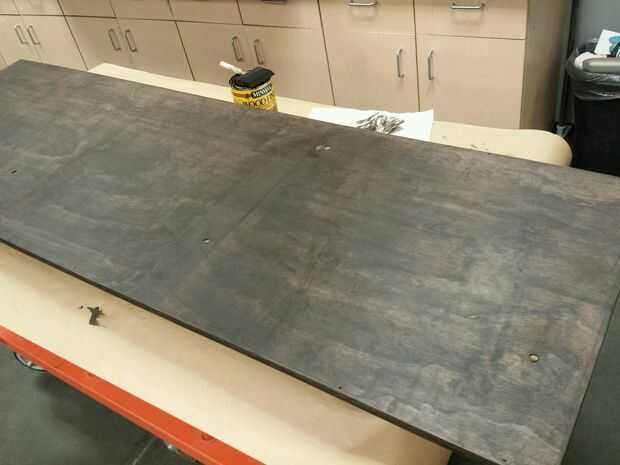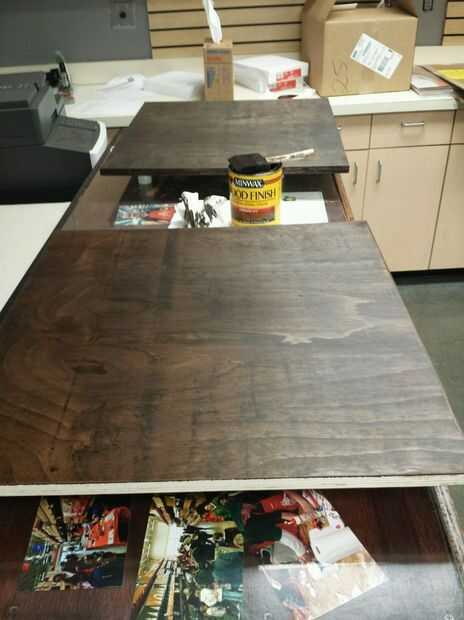 Tuve contacto con los padres de Lota una preferencia de color al que ellos respondieron que querían una oscura de madera pero no negro. Después de hacer alguna muestra manchas en algunos pintura de madera revuelva palos, todos estuvimos de acuerdo en el café más oscuro manchas Minwax. Esto fue un poco estresante para mí porque yo había manchado nunca nada sobre este grande de una escala. He hecho retoque de manchas con mancha de plumas... pero sabía que no era lo mismo. Después de ver unos videos explicativos de YouTube y pedir el asesoramiento de nuestro equipo de la sección de pintura, me sentí lo suficiente confianza como para afrontar esta tarea. Salió mucho mejor de lo que hubiera esperado.