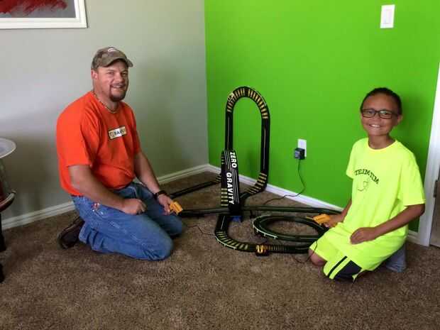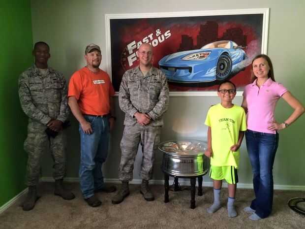 Al día siguiente cargué mi camioneta con el libro de caja, soporte de la noche y expulsó a casa de Lota. Sabía que su habitación estaba siendo renovado, pero no había podido ver en todos mientras que se está trabajando en esa toda la semana. Mientras esperaba pacientemente en la otra habitación, varios de nosotros trasladó el caso del libro en (asumió el 4 de nosotros para moverlo, las llantas y madera gruesa de 3/4" tiene pesados verdadero real rápido!) y el soporte de la noche. Llegó el momento para revelar su habitación terminada a él y a sus hermanos. Lota fue derribado y no podía creer sus ojos. Creo que he visto a un hombre joven más elogioso antes era sonrisas y de gracias todo. Además de lo que he construido, nuestra tienda en mano artista pintó un rápido y furioso mural para su pared, las paredes fueron pintadas, su armario tiene un organizador nuevo instalado, y todas sus medallas de la maratón habían sido montados y colgados para arriba para él.