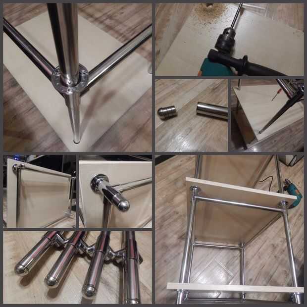 El primer paso: el material. Pipa de acero, cortada en 4 rebanadas largas (bastidor base de la columna), 6 cortos pedazos a lo ancho de sus estantes, estantes a lo largo de 6 piezas. Segundo paso: montar la base. 4 en el bastidor base para construir la "planta baja" de los tubos transversales. Hace 4 a través de orificios en las esquinas de la tablita de madera. Ponemos en estos agujeros del bastidor base. Repita el segundo paso para la construcción de "pisos" de siguiente. Etapas en la foto.