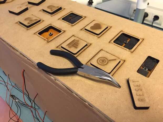 3. antes de pegar todo, prueba si usted hizo el agujero en el lugar correcto. O de lo contrario no funcionará el botón todo. Hacemos esto poniendo el botón de madera en su lugar. Si pulsa en y sentir que es ser clic en el botón de Arduino, todo está bien! Al no oír o sentir nada, gran oportunidad es que necesita hacer otro agujero.