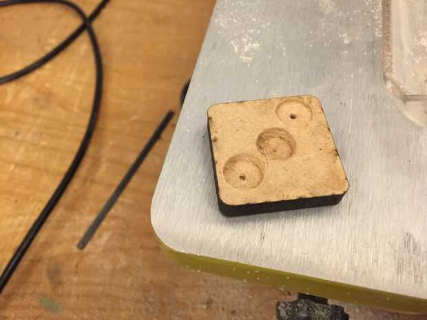 2. a continuación vamos a hacer un agujero que no va a través del botón de madera. Hacemos esto para que la parte superior del botón Arduino va dentro el botón de madera. Esto, junto con la espuma, crea el efecto hinchable. (La imagen se muestra con tres agujeros, era sólo una prueba para ver la profundidad del agujero debe ser. Te recomiendo hacer una prueba primero, porque cuando el hoyo es demasiado profundo, puede dañar la parte frontal del botón. El botón que realmente vas a usar sólo tendrá un agujero)