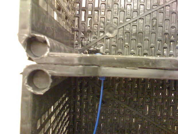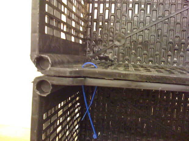 Cuando tienes los contenedores de donde quiere, a tomar uno de tus ataduras de cremallera, deslizarse a través de los lados de los recipientes donde va alrededor de ambos, y a deslizar la cremallera atar hasta su final y apriete. Puede cortar el extra y girar el lazo a dónde está su final entre los contenedores. Y a repetir en el otro lado. Para mayor apoyo, poner algunos (menos una) hacia atrás (en la parte inferior de los envases) a través de los lados. Te recomiendo hacer esto, pero si usted es corto en ataduras de cremallera, es opcional.
