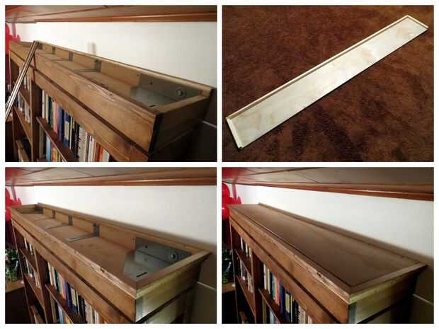 Añadí algunas molduras a la parte superior del bastidor, para que se vea más como el resto de nuestros muebles y remató la cenefa con una hoja de madera contrachapada de 1/4". Superó la madera contrachapada con tiras delgadas de madera así que él fue traído al ras con la parte superior de la moldura. La cenefa está allí para detener la librería caerse y no está diseñada para sostener objetos pesados, por lo que sólo deben poner cosas luz allí - no es realmente un estante extra.
