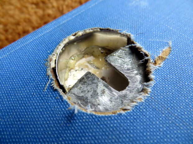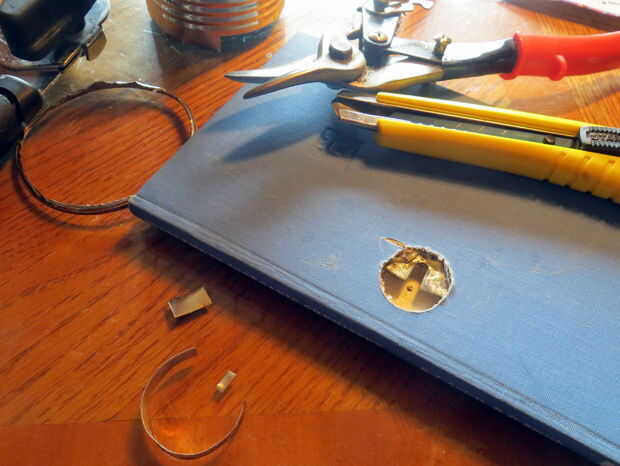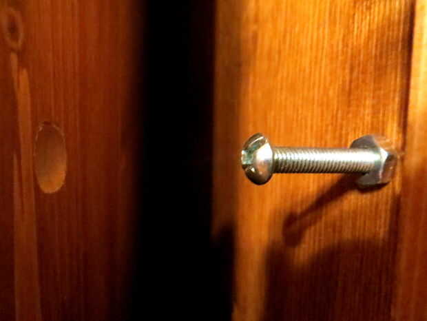 Todas librerías puerta secreta decente necesita una cerradura igualmente secreta, así que construí uno de un libro de tapa dura, un tornillo y una placa de acero redondeada de un una vieja caja de conexiones. El perno fue montado en un agujero en el lado de uno de los casos. Otro agujero, lo suficientemente grande como para acomodar la cabeza del perno, éste fue perforado a través de las otras. La placa de acero fue cortada y pegada en el interior del libro de tal manera que capta la bolthead, prevención de los casos de apertura. Empujar el libro en versiones de la bolthead. El agujero en el libro que expone el mecanismo está repleta de una pieza delgada de acero de una lata de spaghetti, así que hay un buen "clic" cuando empujas el libro.