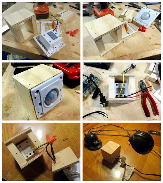 Sería muy fácil dejar accidentalmente la luz en dentro del estudio, por eso he querido una luz de sensor de movimiento. Compré un interruptor del sensor , pero tuvo que hacer una caja para él fuera de recortes de madera, ya que no tengo un lugar adecuado para montar en la pared. Usé un cable de energía de exceso de un escáner roto para hacer más flexible la colocación. Enciende cuando se abre la puerta y de nuevo después de unos minutos (a menos que detecta el movimiento, por supuesto).