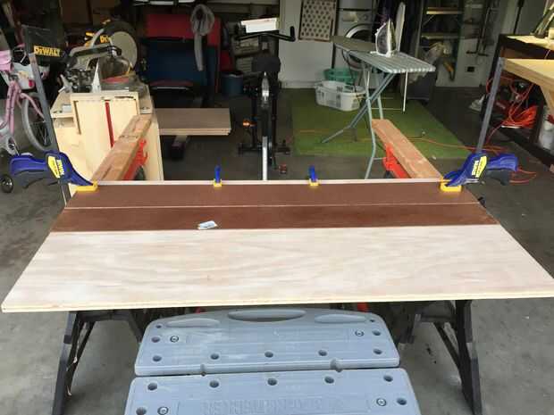 No tengo una sierra de mesa, así que compré una hoja de 80 dientes para mi sierra circular. También construí una plantilla simple de madera para rasgar la madera en piezas rectas de aproximadamente un pie de ancho. La plantilla es super sencillo de hacer y muy eficaz. Hay toneladas de planes en línea, pero la idea básica es hacer un borde recto que colinda con la base de su sierra y a la vanguardia que marca donde va la cuchilla para cortar. (Si el lado inútil está a la izquierda [en el lado de la hoja], luego coloca la marca y el derecho la plantilla donde quieres hacer el corte. Si la pieza que desea está a la izquierda, luego agregue el ancho de la hoja [probablemente de 1/16 de pulgada] a la medida). Todos los cortes al hilo hice primero y luego cortar las longitudes.