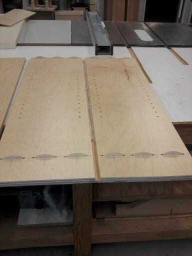 Después del primer corte, ajustar la guía a 1/8" y la altura de la hoja a 3/8". Ejecutar las juntas a través de la sierra en el borde con el interior cara de los tableros frente a la cerca de Sierra de mesa. El material de desecho se caerá.