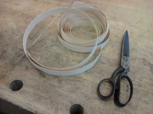 Las bandas de borde será ligeramente más ancha que la madera contrachapada. Utilice un cuchillo o navaja para recortar el exceso ancho. Cortar los extremos al ras con el tablero.
