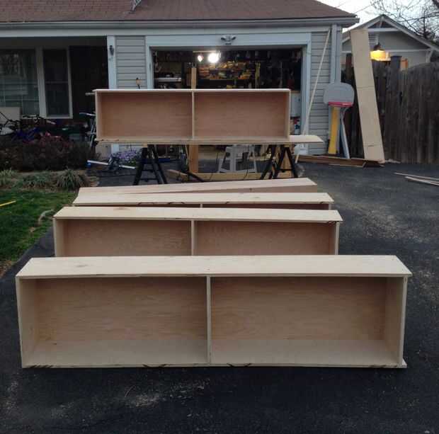 Una vez ensamblados, los estantes se pueden lijar bien antes de la imprimación y pintura. Estas unidades fueron instaladas en un sótano y recortadas como empotrados. Este proyecto fue muy recto hacia adelante con muchos cortes repetidos y perforación. Me pidieron construir éstos para un vecino, para que no realice la instalación o ajuste. Pero fue un muy buen proyecto para trabajar en algunas habilidades de carpintería. Tengo un montón de ideas para utilizar estos mismos métodos en futuros proyectos alrededor de mi casa. Gracias por tomarse el tiempo para verlo!