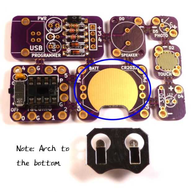 1. Soldar el soporte de la batería con la abertura arqueada hacia abajo. Este componente requiere un calentamiento más largo tiempo al soldar porque el metal irradia el calor lejos rápidamente.