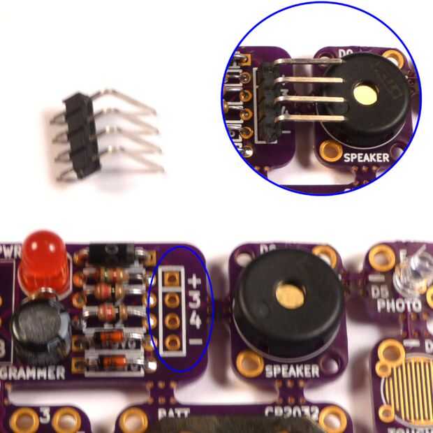 1. El ángulo recto de 4-pin header es opcional y utiliza sólo si las placas están separadas y que desea reprogramar el microcontoller. Soldadura con las clavijas que se extiende sobre el altavoz como se muestra.