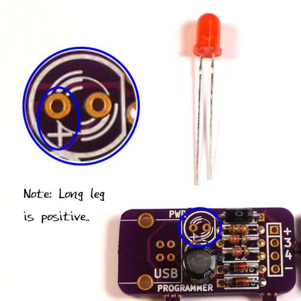 4. Se utiliza un rojo 5 m m LED para indicación de alimentación USB. Observar la polaridad. La pata larga es positiva y va en el agujero adyacente a "+" en la serigrafía.