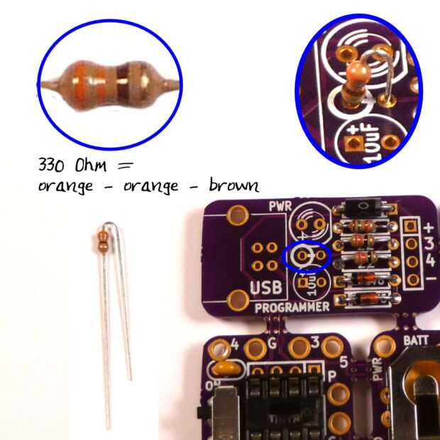 2. Una resistencia de 330 ohm está montado verticalmente entre el condensador y el LED. Su código de color es naranja-naranja-marrón-oro. Doblar como se muestra y soldadura en el lugar.