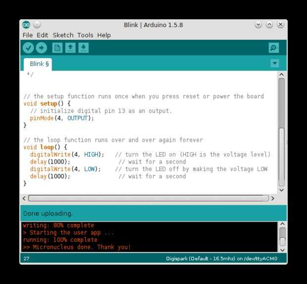 - Usted debe recibir un mensaje de que el bosquejo fue subido con éxito, y el LED empieza a parpadear.