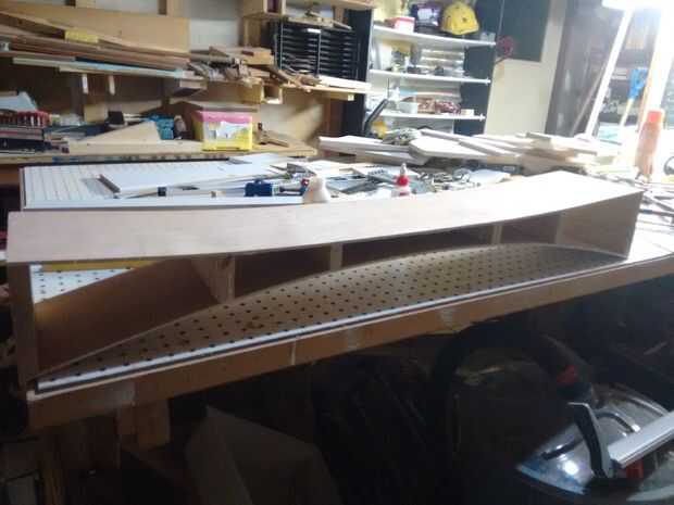 Cuando todas las piezas han sido pegados, unte pegamento a lo largo de las caras angulosas y otra pieza de 1/4" madera contrachapada que se ha cortado a la misma anchura como antes pero no corte a la longitud de la gota. Encolar y clavar a las costillas de madera sólidas.