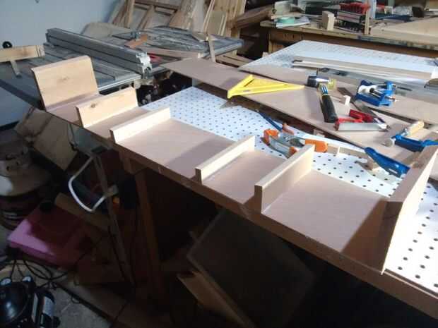 Pegar cada pieza, al posicionamiento en el centro de los tableros sólidos a lo largo de las líneas marcadas en la madera de la parte plana. Esto requiere la sujeción de piezas en ángulos de 90 grados, por lo que debería ser fácil con un jig de esquina, o una velocidad de recambio de fijación en la madera contrachapada y empalmar la madera maciza de las costillas hacia arriba junto a ella. pegamento y clavo con una clavadora o abrazadera. Si se desea tornillo en usando los tornillos #6.