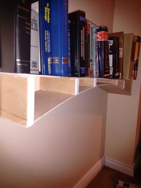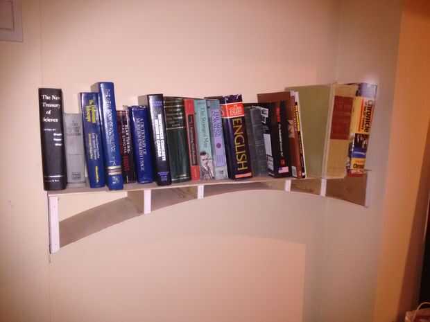 Al cargar libros, intente cargar simétricamente, desde lo extremos hacia el interior. Esta bandeja no tiene visible pandeo cuando cuando está cargado de un lado y a pesar de que el pegamento no se había secado todavía (es decir, sólo celebró con los clavitos.) La fuerza de la plataforma viene desde el diseño del arco sí mismo, y las fuerzas horizontales aplicación por la pared. Sin embargo, el estante entero es lo suficientemente ligero como para levantar con un dedo.