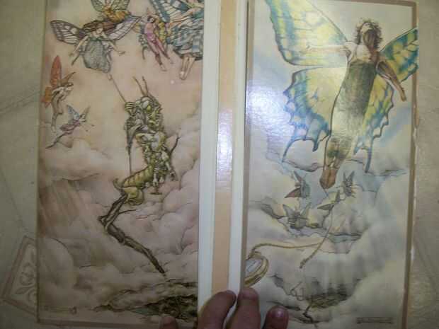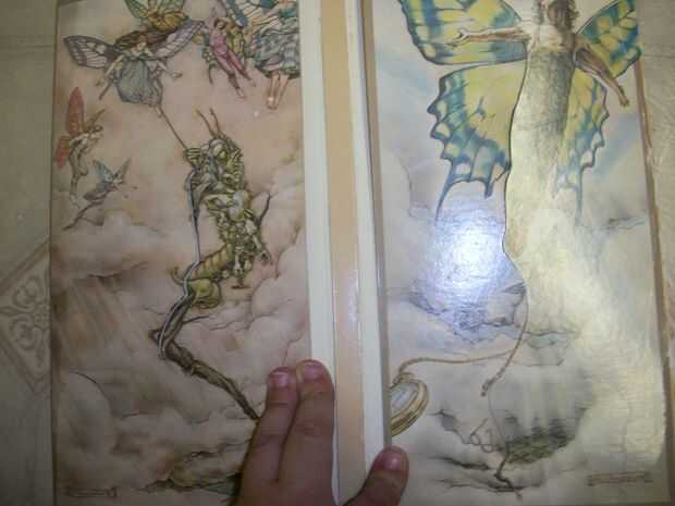 Abrir el álbum y colóquela sobre una superficie o la almohadilla de corte. Cortar sólo la parte (en mi caso las ilustraciones) que hará el frente y bolsillos traseros y asegúrese de mantener los cortes de los bordes. Use una cuchilla Exacto y corte en algún lugar en el centro. Cuando se pliega debe parecerse a mi foto.