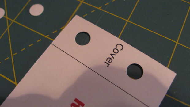 Utilizar la navaja X-acto, perfore agujeros en la parte superior e inferior de la piel directamente sobre los orificios en las tarjetas. Ponga el perno a través y apriete la tuerca en la parte posterior.