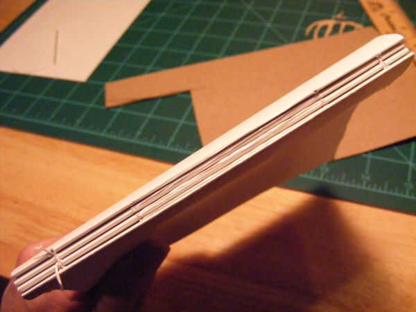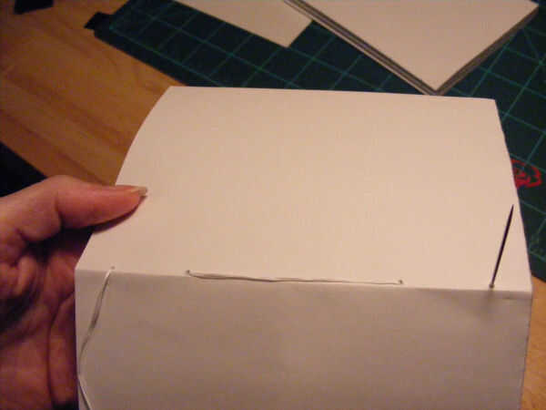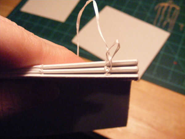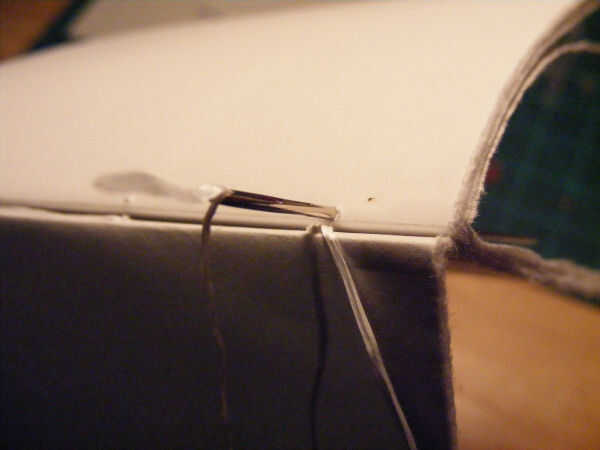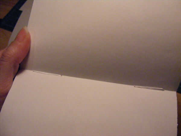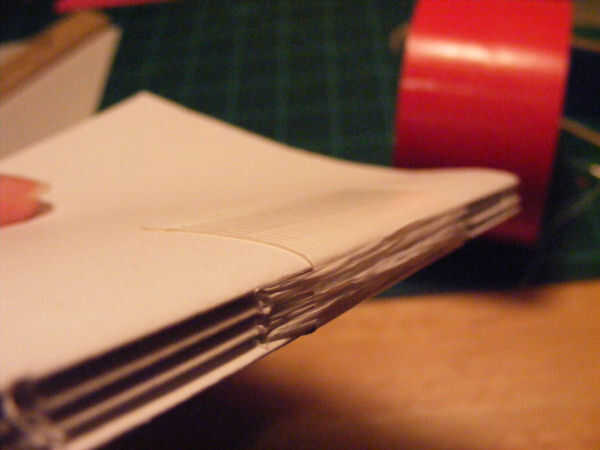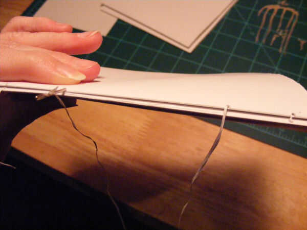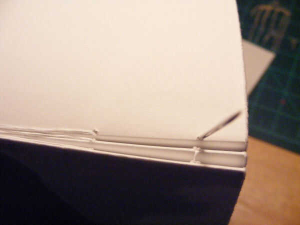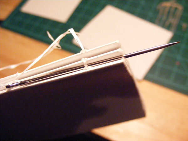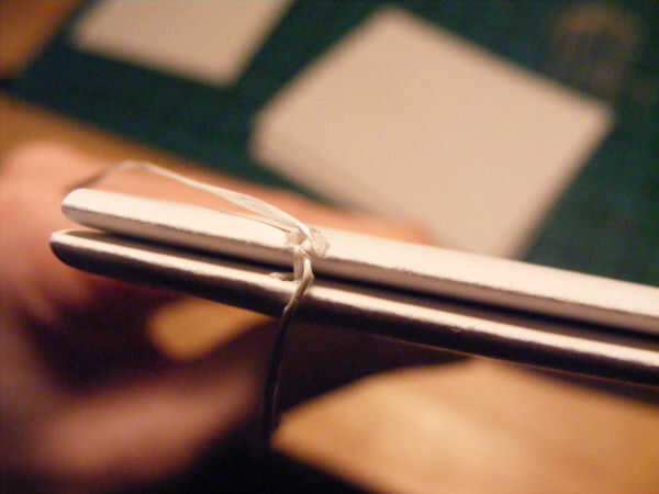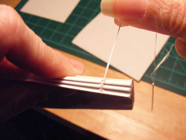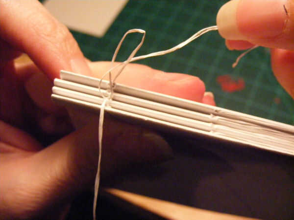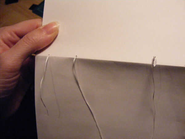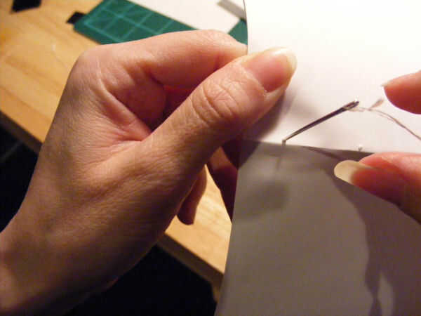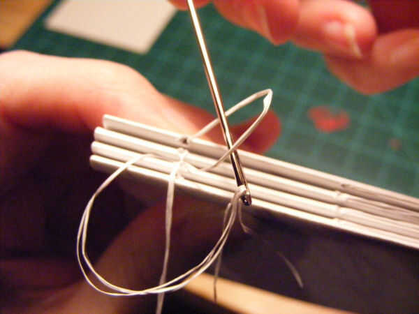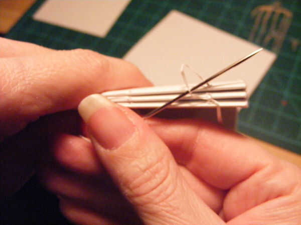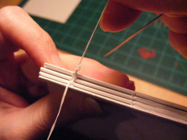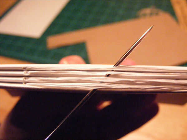 Coloque la segunda firma en la cima de la primera, alineando los agujeros. Empuje la aguja a través de la parte posterior al frente, atar las dos firmas. Repetir el punto de entrada/salida. Una vez más, tire suavemente hacia afuera para asegurarse de que la Unión esté apretada y las páginas alineadas. Ahora un nudo doble con la cola y el hilo de roscado.