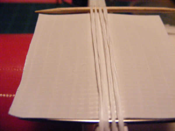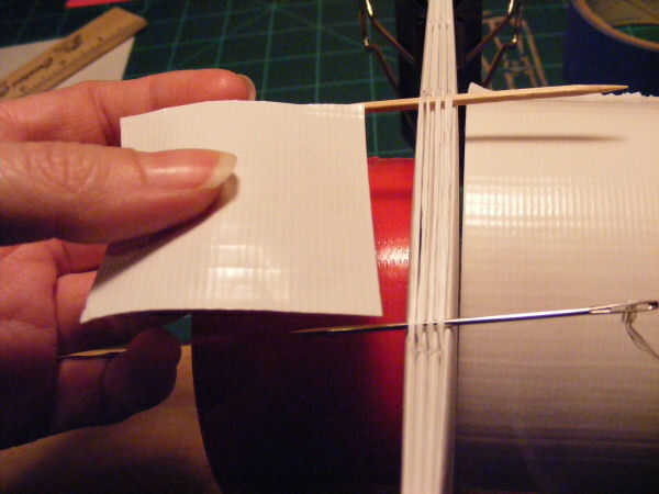 Para mayor apoyo, empuje la aguja y un palillo a través de los hilos del centro a lo largo de la parte posterior. Corte un trozo pequeño de cinta adhesiva para conductos, cerca de 2 "x 2" y con cuidado la cinta bajo la seda del hilo de rosca. Asegúrese de que todo está correctamente alineado y suave hacia abajo de la cinta.