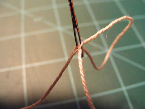 Repetir con la tercera firma. El hilo debe estar en el pliegue posterior, opuesto al lado que es el nudo. Deslice la aguja entre las firmas primeras y la segunda, desde el centro (lado izquierdo) hasta el borde exterior (lado derecho). Tire del hilo a través hasta que quede un pequeño bucle. Empuje la aguja a través del lazo (por la izquierda a la derecha). El nudo formando debe parecerse a una figura 8. Tirar hacia arriba suavemente hasta que el nudo se establezca y que darle un tirón firme para bloquear en lugar. La segunda firma esto unirá a la tercera firma.