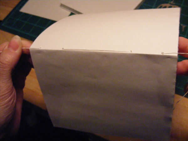Alinee los bordes de las firmas. Tener una firma y pasar la aguja en el primer agujero (comenzando en el lado izquierdo) de la parte trasera dejando una cola de 2 o más pulgadas. Utilice un simple y coser a lo largo del borde. La aguja debe enrollar para arriba en el pliegue de la espalda (lado derecho). Jale suavemente la seda burla tirando hacia los bordes.