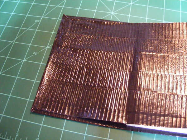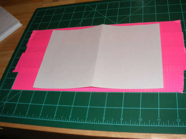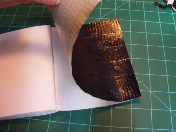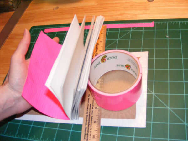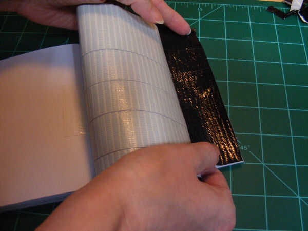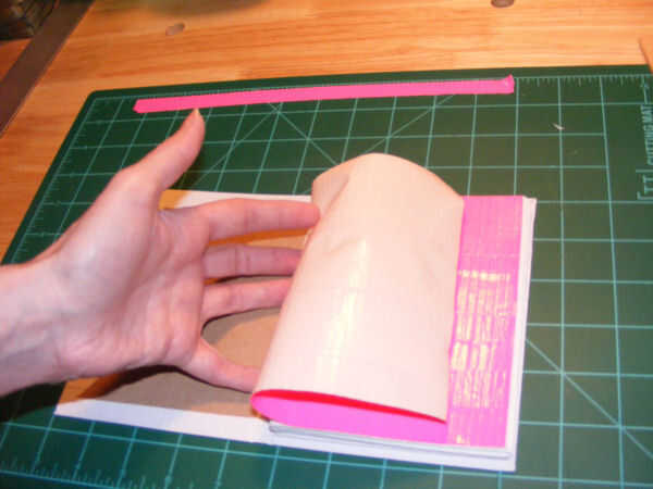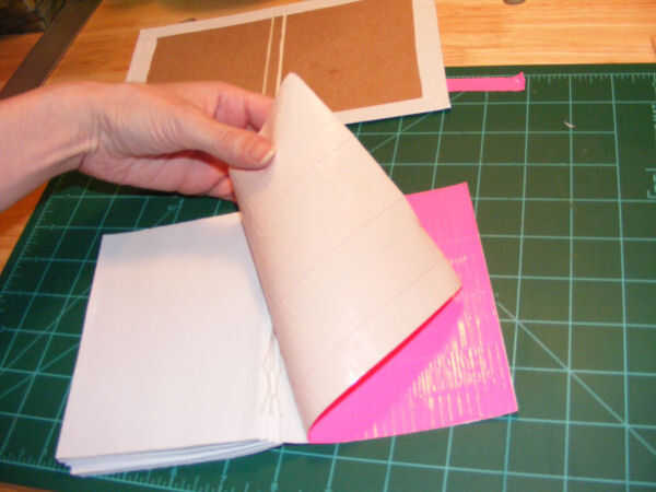 Coloque la tapa del lado cartón boceto libro para arriba. Línea de la columna vertebral teniendo cuidado de mantener el conducto cinta de flyleaf de la cubierta. Un rollo de cinta de conducto se puede utilizar para ayudar a sostener las páginas en su sitio. A partir de la columna vertebral, gire suavemente el flyleaf a lo largo de la cubierta del libro. Una vez que esté en su lugar, cerrar el libro para comprobar la alineación. Otra vez, si la alineación está apagado con la cubierta, puede ser reajustado en este momento.