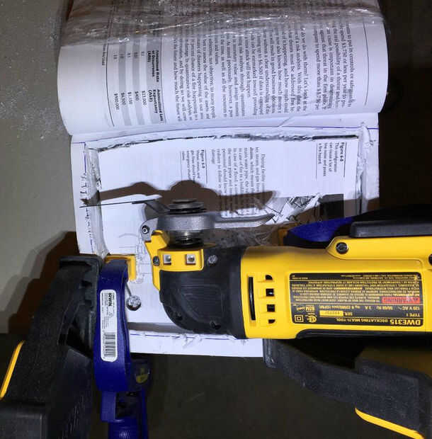 El libro de la abrazadera hacia abajo y utilizar un multiherramienta oscilante o una sierra de intercambio para cortar el cuarto borde más cercano a la encuadernación.