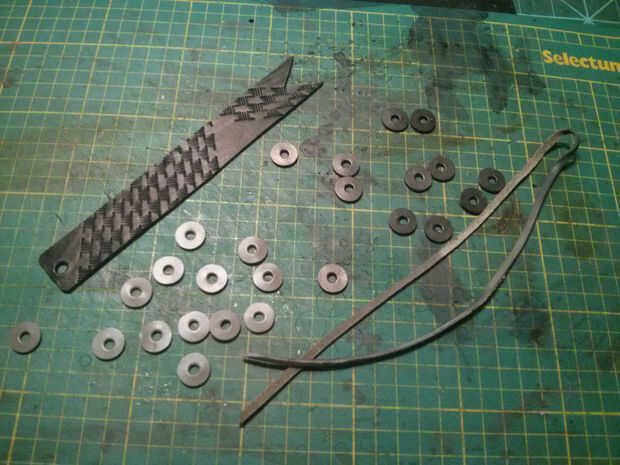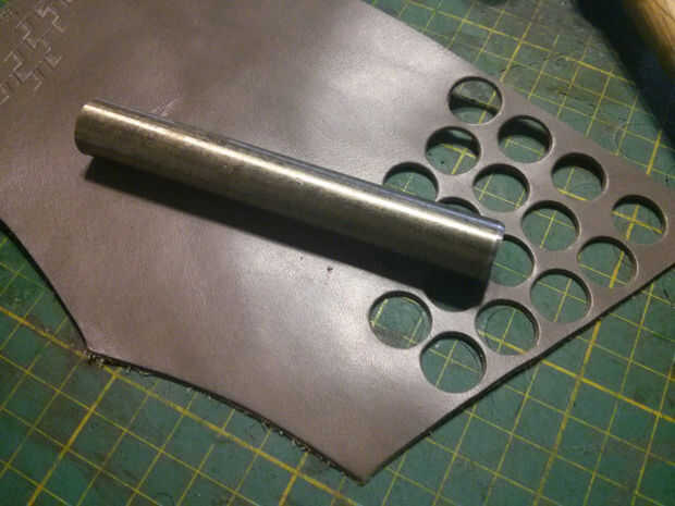 Necesitaba damas que eran aproximadamente. 5" de diámetro. Por desgracia, tuve un golpe que podría crear estas piezas, así que utiliza un pedazo de tubo, (una viejo barra de cortina) y afilar un borde con mi amoladora de banco. Esto funcionó a la perfección y era capaz de crear todas las 24 piezas. A continuación perforados un agujero más pequeño en el centro de cada pieza para el tanga podría pasar a través de ella para el almacenamiento.