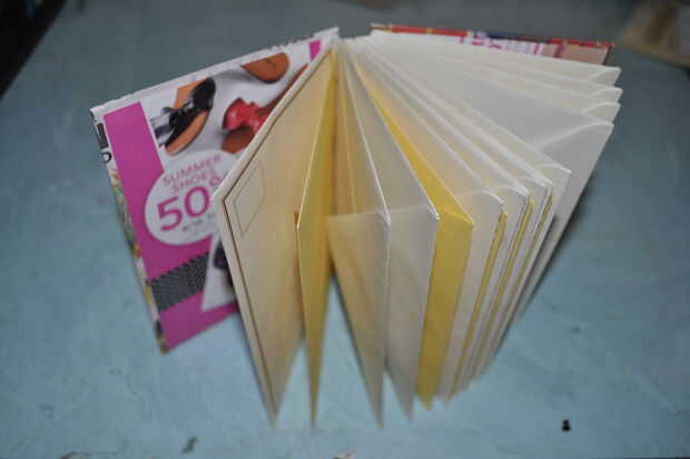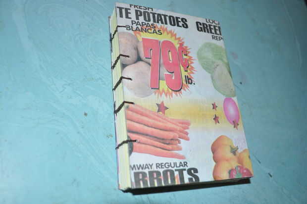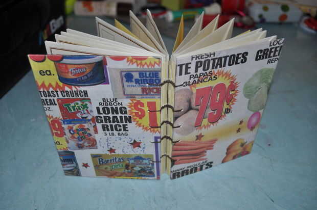 He comenzado recientemente recorte cupones y encontró que el acordeón de plástico libro regular no era mi estilo, así que utilicé algunos de mi escondite de misc y algún correo no deseado. Fuentes son anuncios de periódico (tapa), correo basura, Bainbridge 2000 sentencia Junta mecánica, palillo del pegamento UHU, punzón, regla, almohadilla de corte, sobres (bloque de texto), hilo bordado y cera. Voy a marcar las aletas y título según los carriles en mi tienda, así que sé exactamente qué filas se van a ir a, y encuentro grocerys y otras cosas rápido.