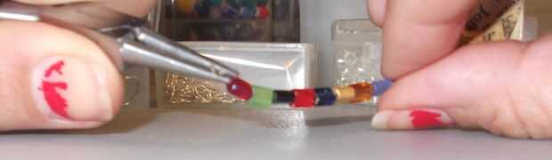 4. Añadir cuentas al perno de ojo (creé un patrón usando ocho perlas cuadradas de 3/16 por ojo pin - bebé azul, ámbar, oro, azul oscuro, azul iridiscente, rojo, verde y fucsia)