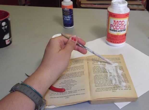 2. Cepillo en una fina pero constante capa de Mod Podge en ambos lados (izquierdo y derecho) de su libro que han cubierto 2 páginas completamente.