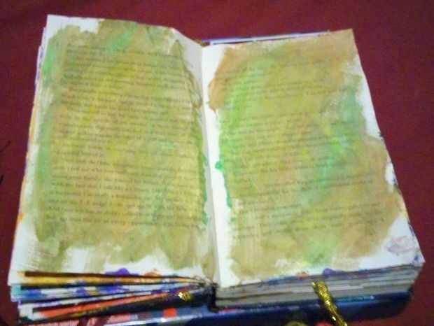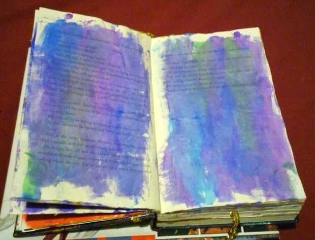 Para la pintura fue divertido pero oportuna. Ninguna pintura va a hacer para el papel en libros regulares. En mi caso, se utilizó pintura de dedo y metálica pintura acrílica. Con la pintura es fácil de ensuciar con paladar de color y encontrar colores que mezclan bien en las páginas. Para la mayoría de las páginas se necesitarían unos 10-20 minutos para secar cada uno con una capa de pintura. Usted querrá apoyar el libro abierto con algo para que las páginas no se pegue uno al otro (aunque eso puede a veces conducir a algunos colores muy cool, chocantes.)
