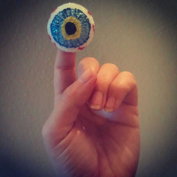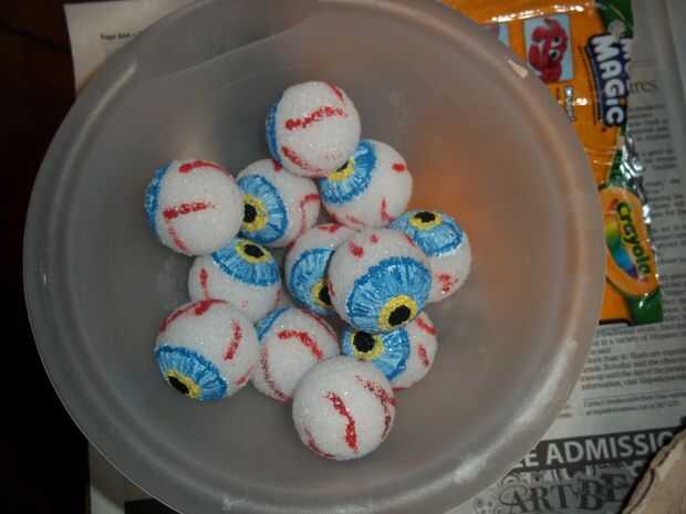 Utilizando la espuma forma cada uno de los globos oculares que cabrían en los dedos de Adán. Usé pintura amarilla, negro, azul y roja para pintar las bolas que parecen ojos. Esto es muy simple pero tenía un gran efecto. Realmente añadido el traje!