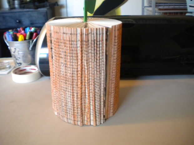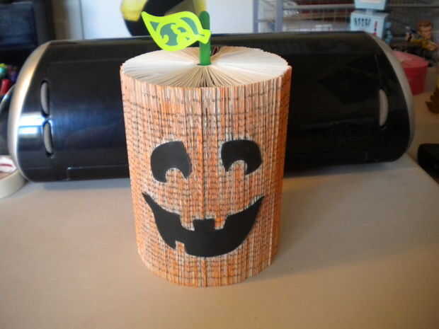 Ahora usted está listo para decorar tus libros. Para las calabazas, usé un palito verde y luego se corta una hoja de fuente de la gitana caliente pegamento en el stick. Luego pega caliente el palillo en el agujero que quedará en el centro del libro después de que se dobla. A continuación, utilizar la cesta de calabaza tallas para cortar las caras y caliente había pegado al frente del libro así.