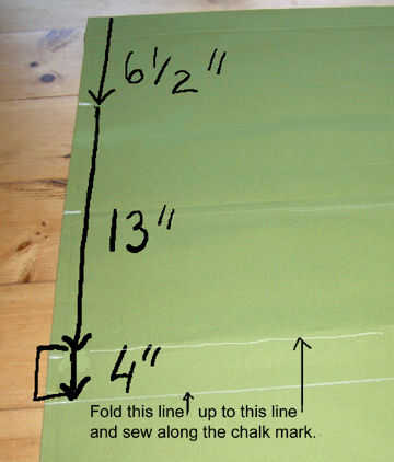 Mida hacia abajo desde el borde superior la distancia están poniendo entre clavijas (para la mina, es 6 1/2"). Marcar sobre la tela (yo uso llano viejo tiza de blanco de la escuela. Limpia después con un paño húmedo.) De esta medida de la marca hacia abajo dos veces la profundidad que desee el bolsillo y marca otra vez. (Mis bolsillos será 6 1/2" de profundidad para medir hacia abajo 13"). Ahora Mida hacia abajo 4" de esto y marca otra vez. Este es su siguiente manga de espiga. Coincidir con las marcas de tiza últimos 2, pin y coser en la tela haciendo otra manga.