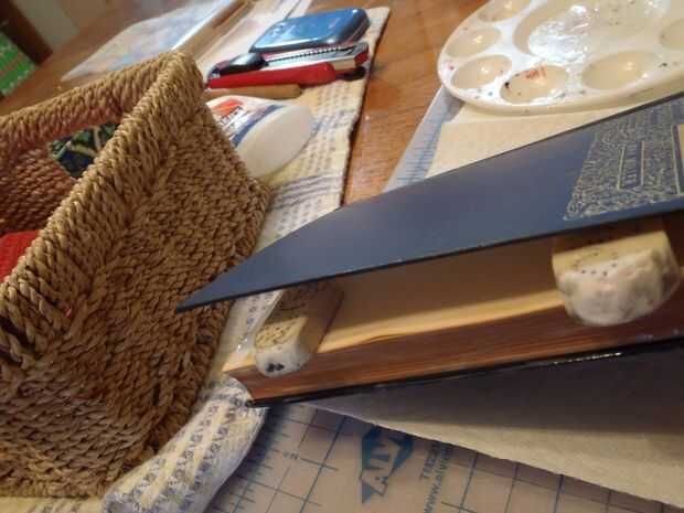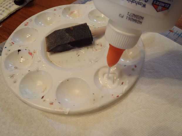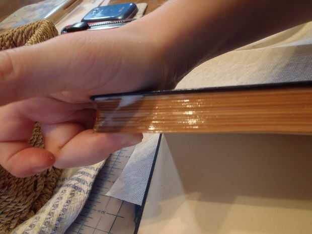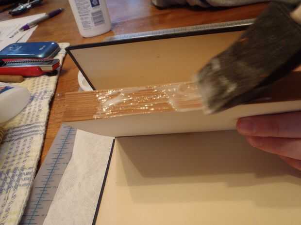 Vierte pegamento en la plataforma hasta alcanzar el borde. Luego, utilizando un pincel de esponja, ponen una capa media de cola en el bloque de páginas. Después de eso, poner dos gomas de borrar en la tapa del libro y después presiónelo bajo unos libros pesados durante veinte minutos.