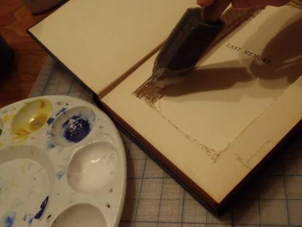 Ahora debe verse así desde el exterior. Ahora, apriete el pegamento hacia fuera, otra vez hasta el borde y ligeramente la capa en el interior del libro, pero manteniendo la página de fondo clara de la cola.