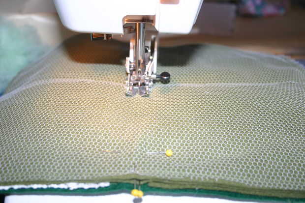 Poner la cara de la tapa hacia abajo y alinee todas las páginas en la parte superior, asegurándose de que están centrados y el espacio alrededor de los lados es la misma. Sosténgalos bien y luego coser el centro con una puntada recta, en una máquina de coser. Un pie esto hace más fácil y hay menos deslizamiento de las capas. Utilizar una puntada más larga que usted normalmente y toma lento. Puede que necesite tirar un poco para ayudar a la mayor parte a moverse debajo de la aguja. Yo generalmente lo coser una segunda vez, simplemente dando la vuelta al final y regresar en la misma línea.