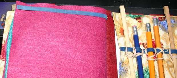 Para los lápices, viró la goma en más lugares a lo largo por lo que permanece en su lugar mejor. Para guardar los lápices de caer hacia fuera, envuelve una cinta de goma ancho más pequeño el lápiz, insertar el lápiz debajo de la banda de goma cosido abajo luego estiró la cinta de goma (el lápiz) en la banda de goma en el libro entonces sobre el lápiz. La banda de goma en el libro actúa como barra en la pared y los lápices están colgando de él.
